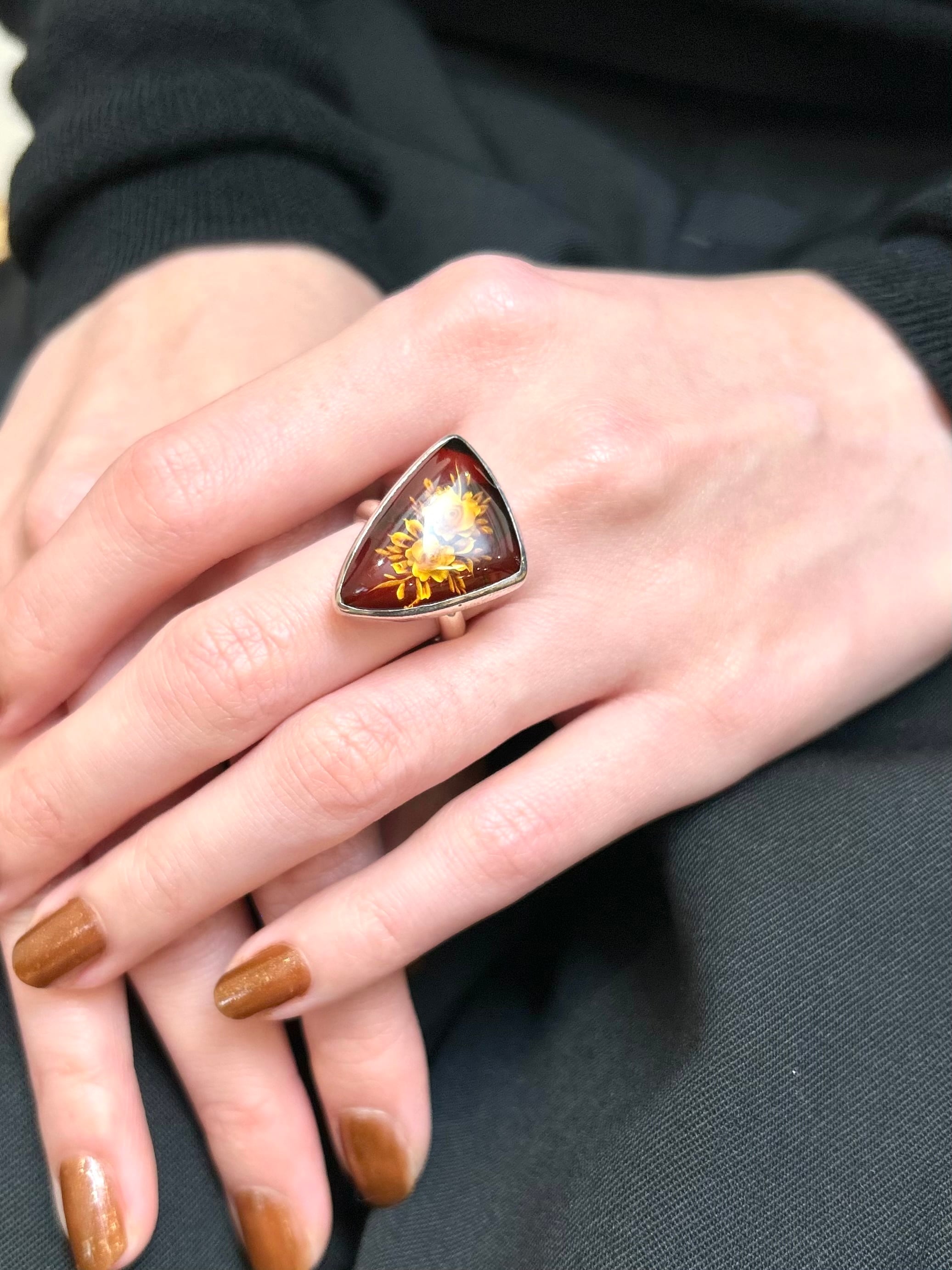Shinzoneの24AWのキーアイテムでもあるROSE。大粒の琥珀にバラの絵柄が彫られたデザインのみでオーダーをしました。4500万年前の琥珀であるバルティックアンバー。バルト海産琥珀のさまざまな色合いで、形もアソートです。天然石とはまた違った重厚な存在感があります。秋冬の手元にとっても映えるリングです。