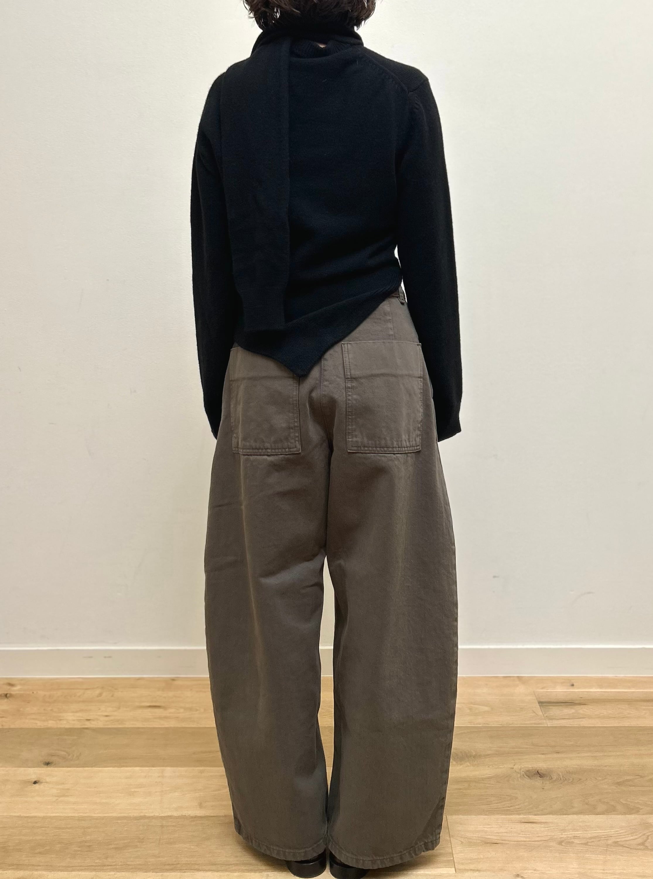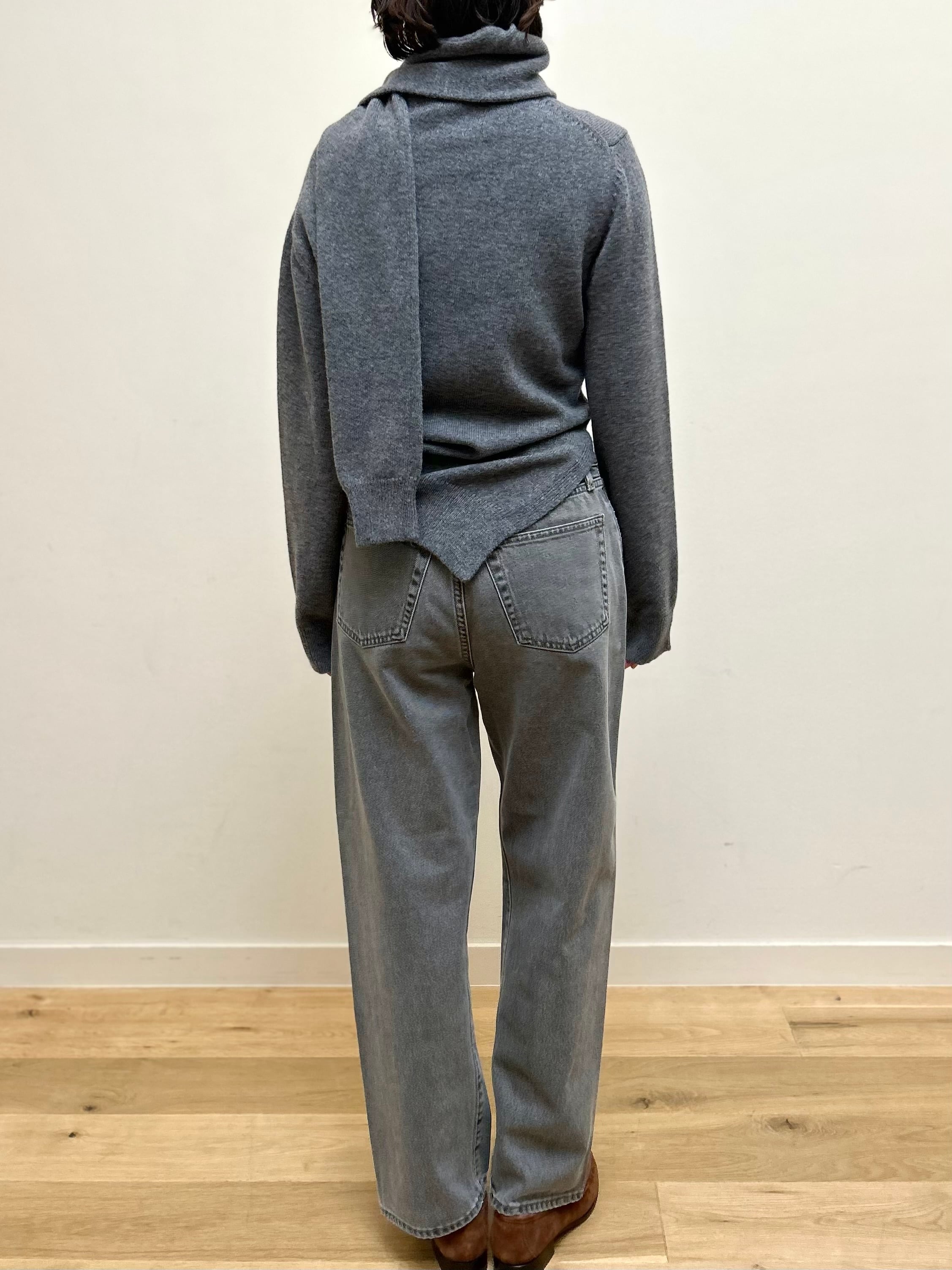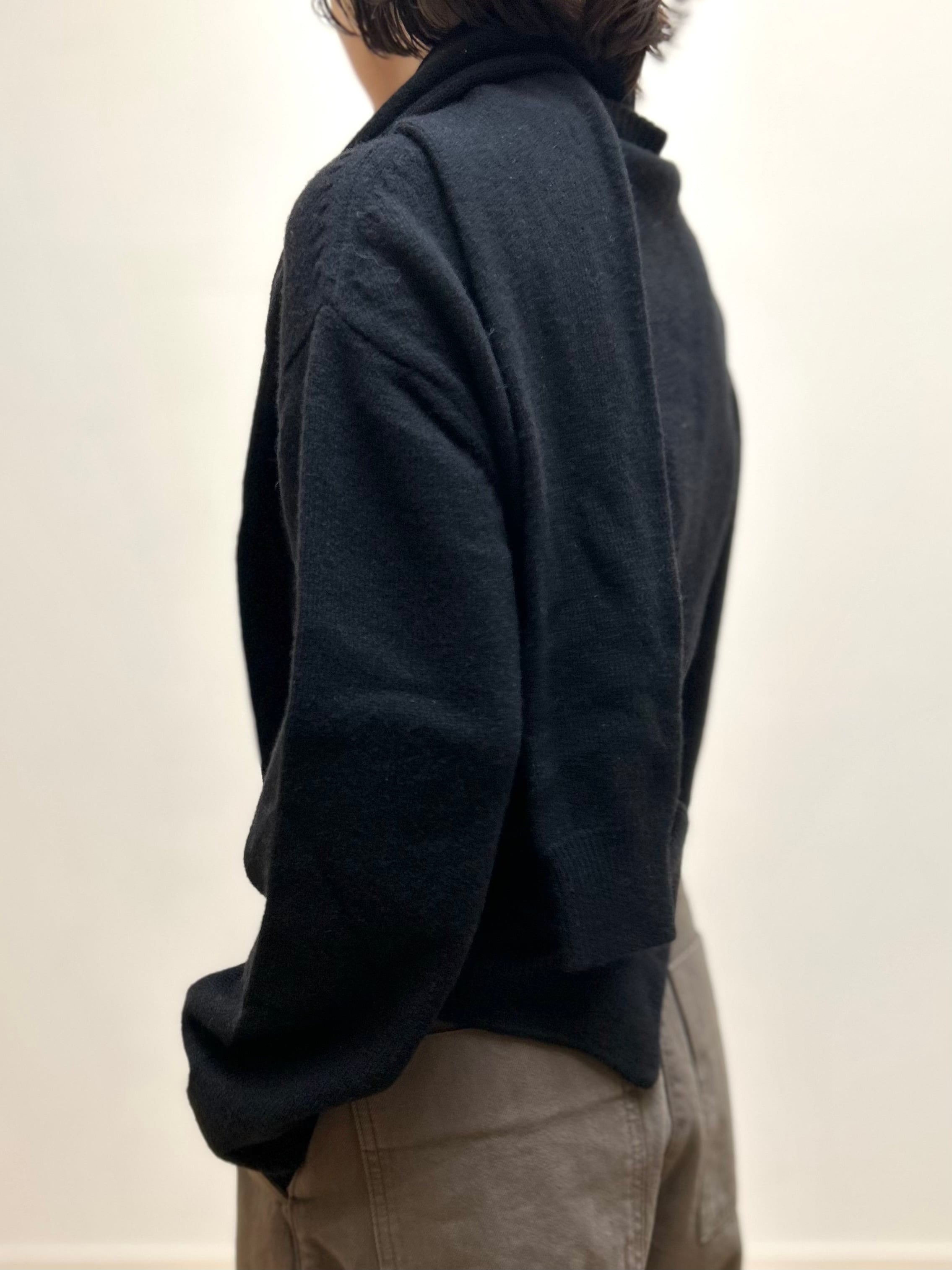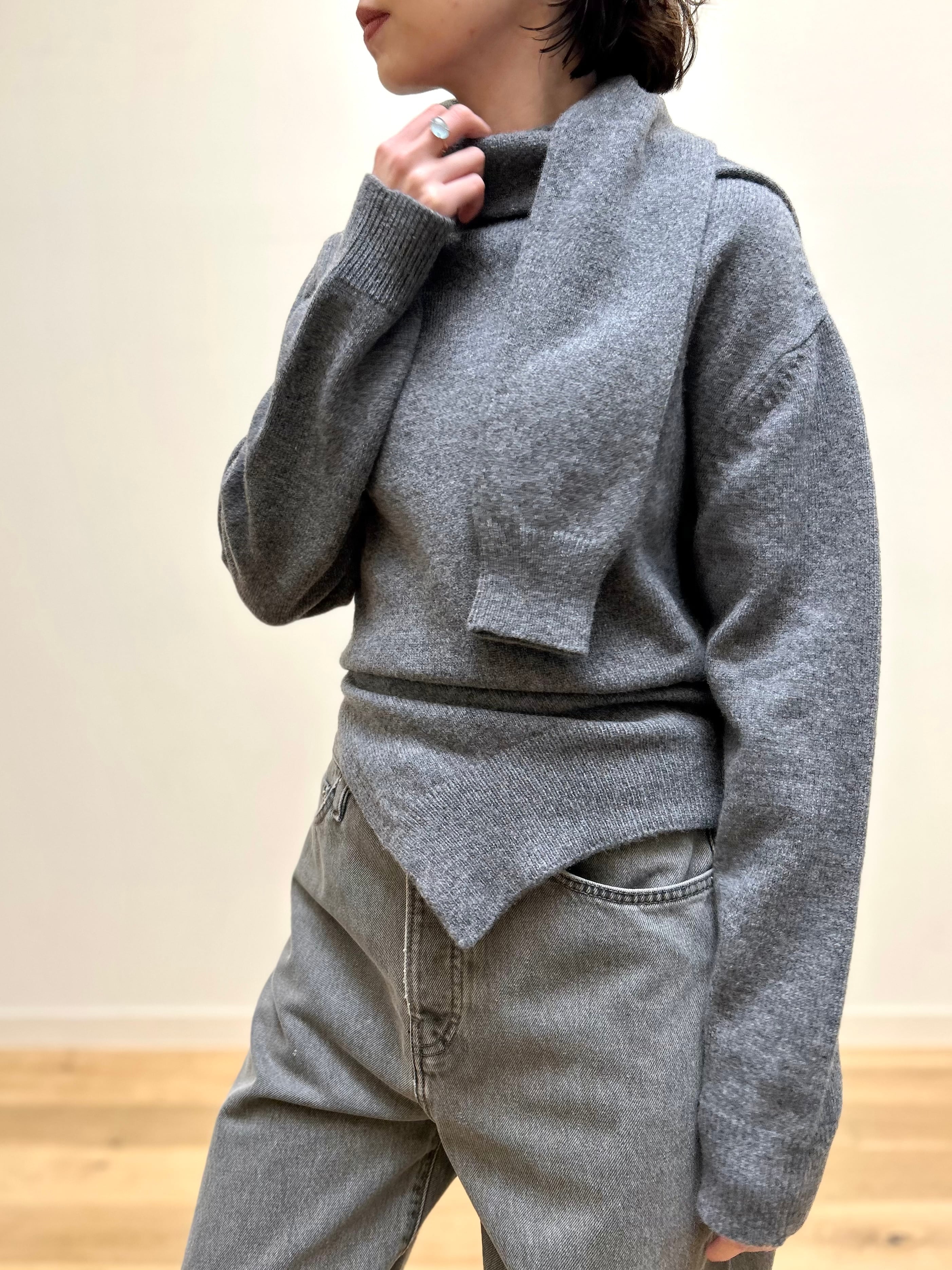 イタリアの工場 Linsieme Filati の上質なメリノウールとカシミア糸で作られたツイスト スカーフ ジャンパー。家族経営のイタリアのサプライヤーが編み上げました。