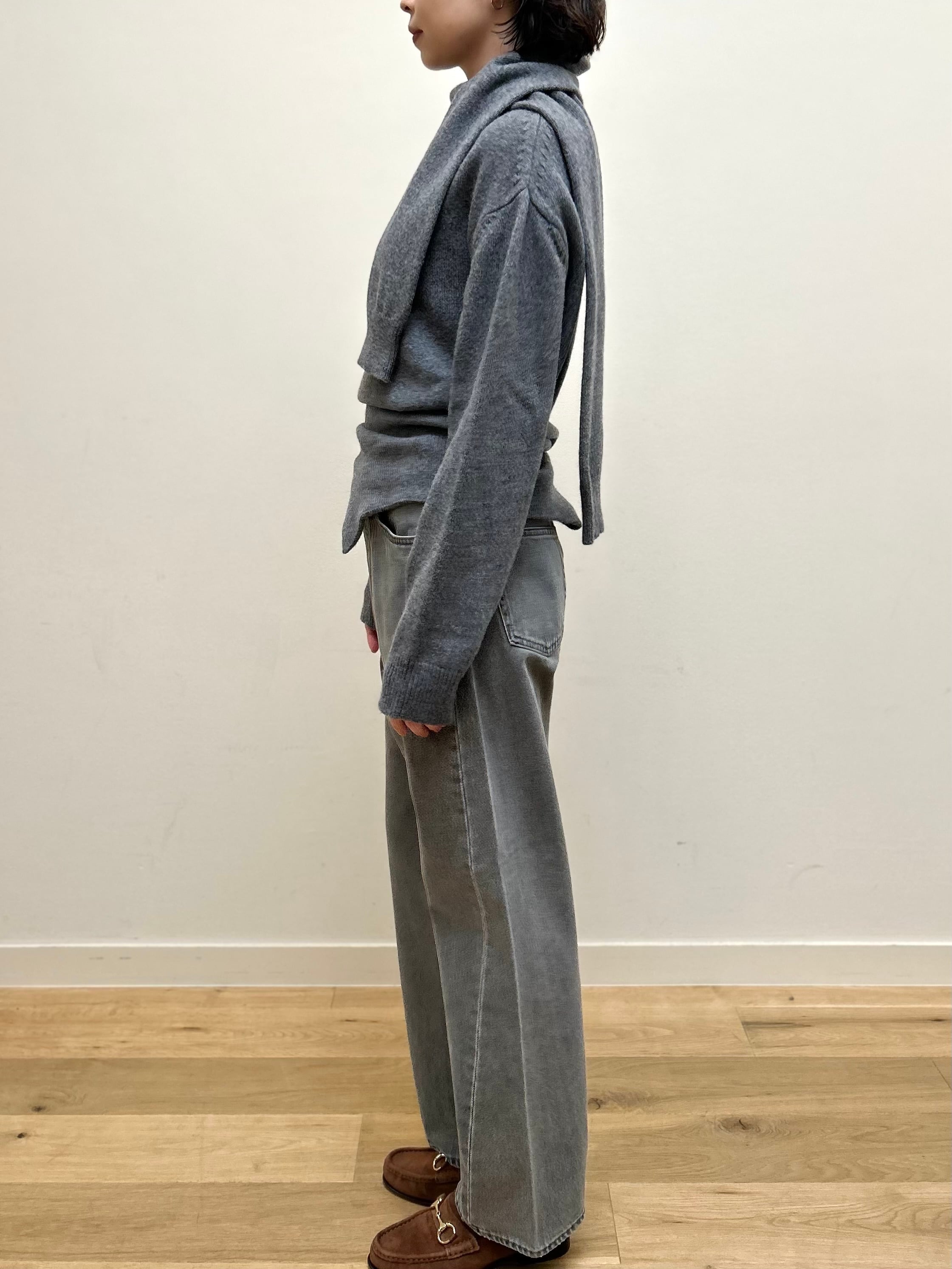 デザインは、スカーフネックラインとツイスト構造の非対称の裾が特徴で、スリムフィットです。スカーフは垂らしたり首に巻いたりできます。