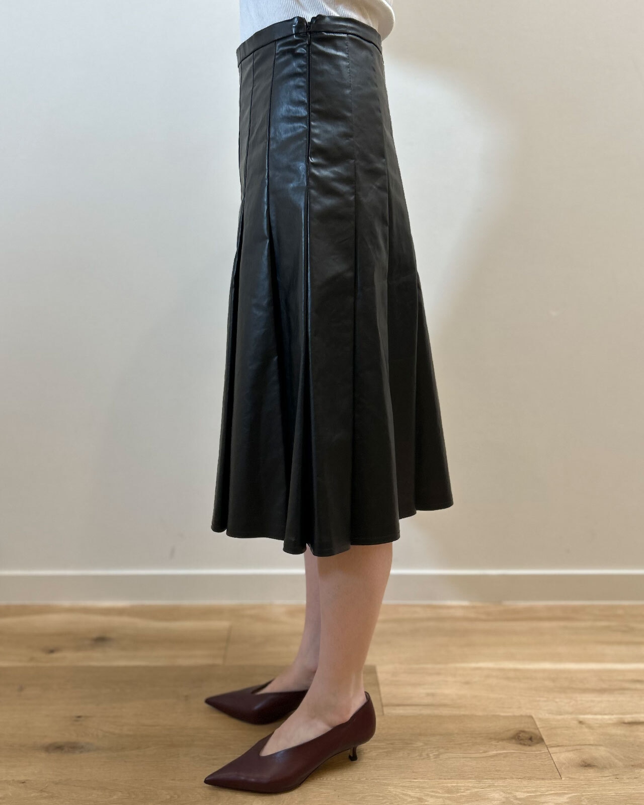 oil素材のハリ感のあるプリーツスカート。ロングブーツと合わせるのもおすすめ。