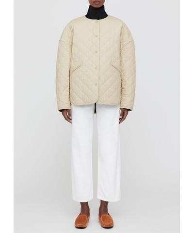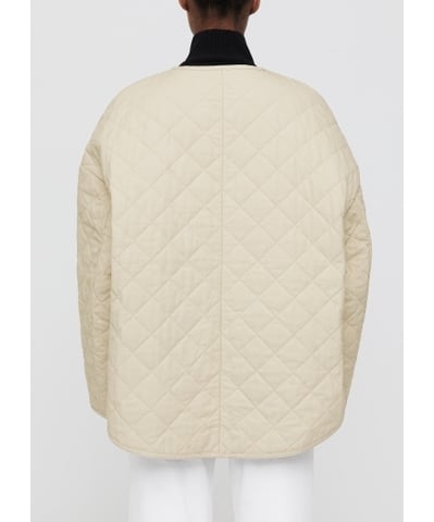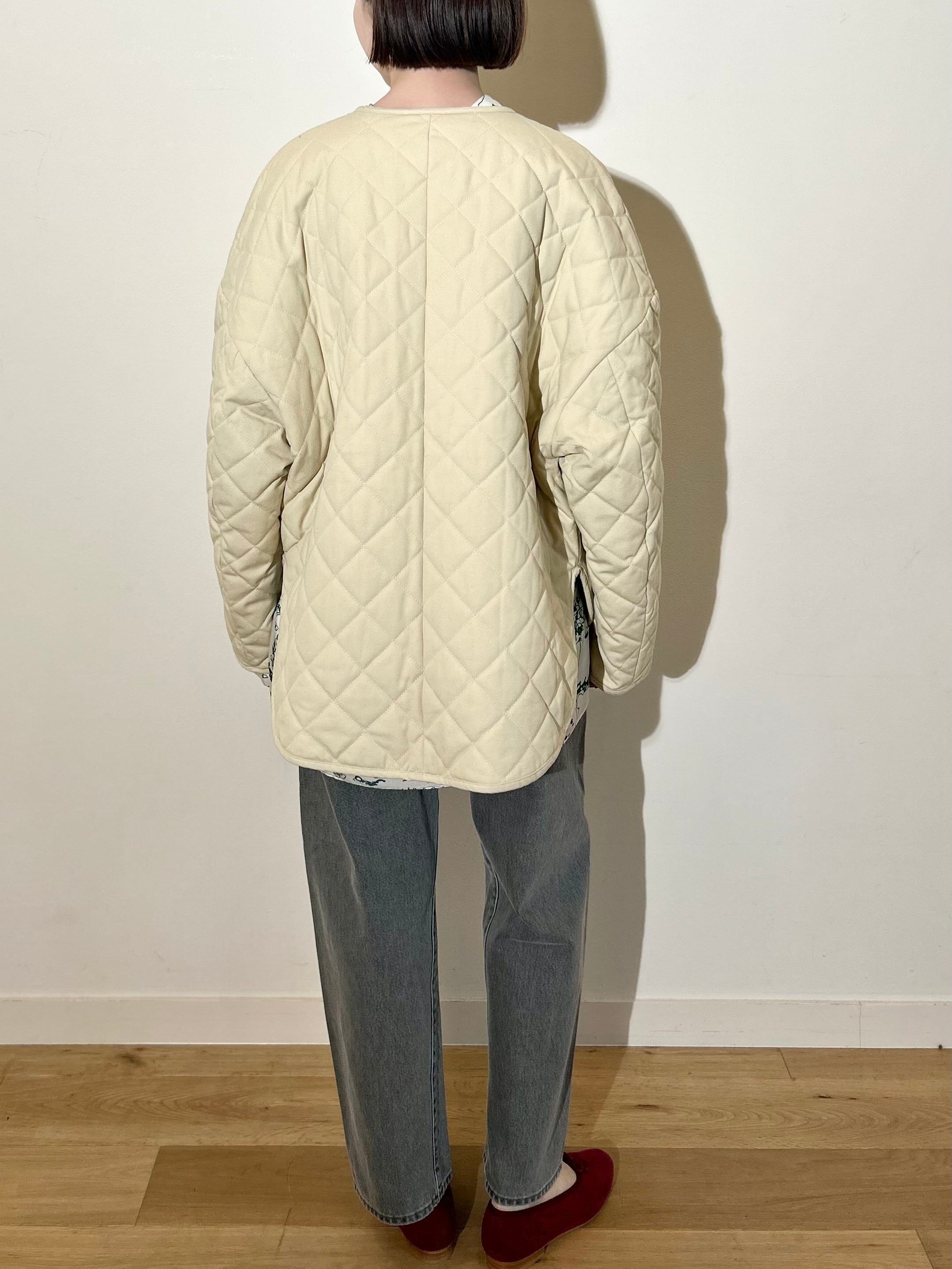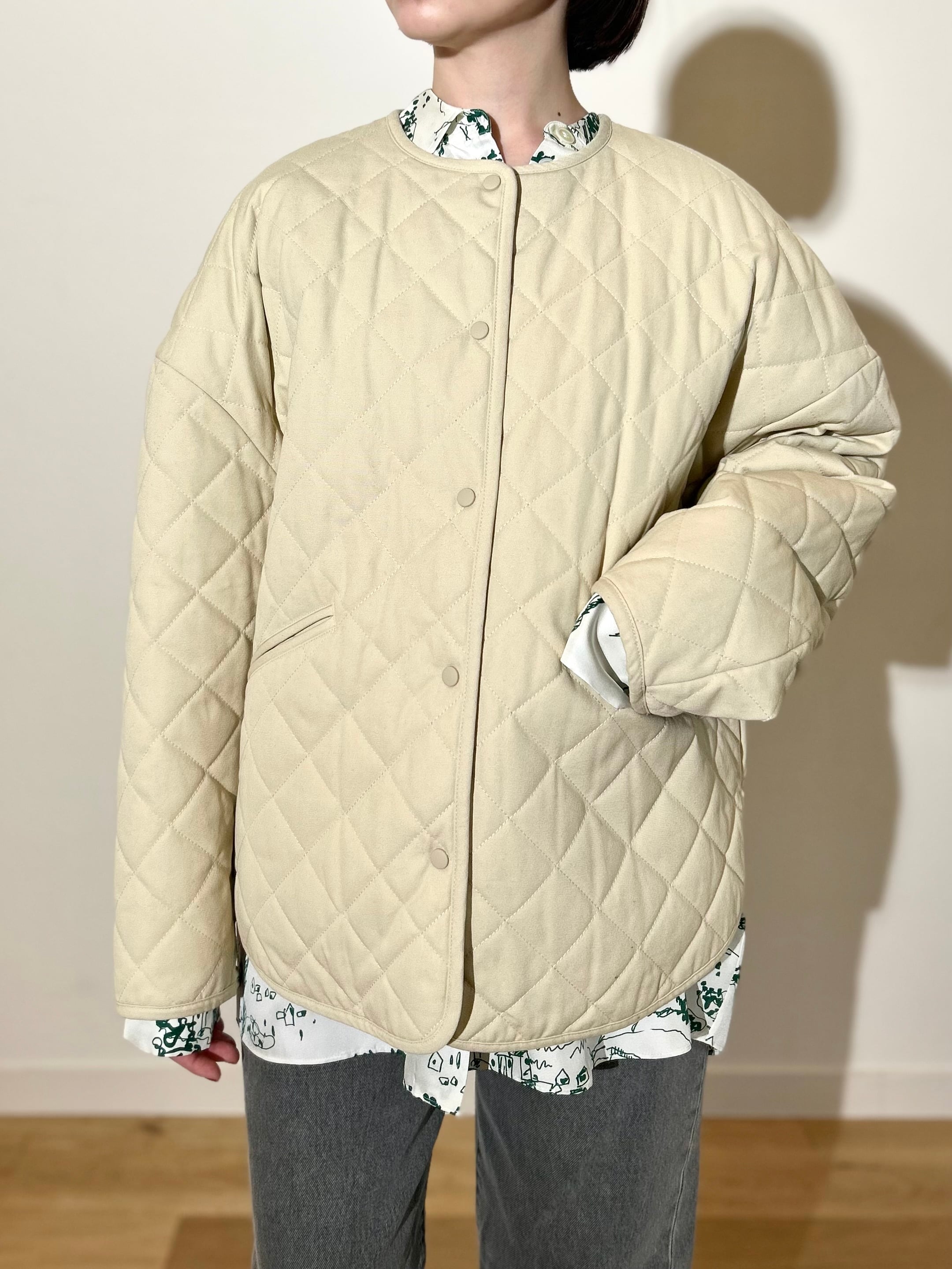 ノーカラーなのでシャツやストールとの相性も良いアウター。キルティングなので中綿が入っていて暖かく、肌寒い秋口からにさらりと羽織るのにおすすめです。